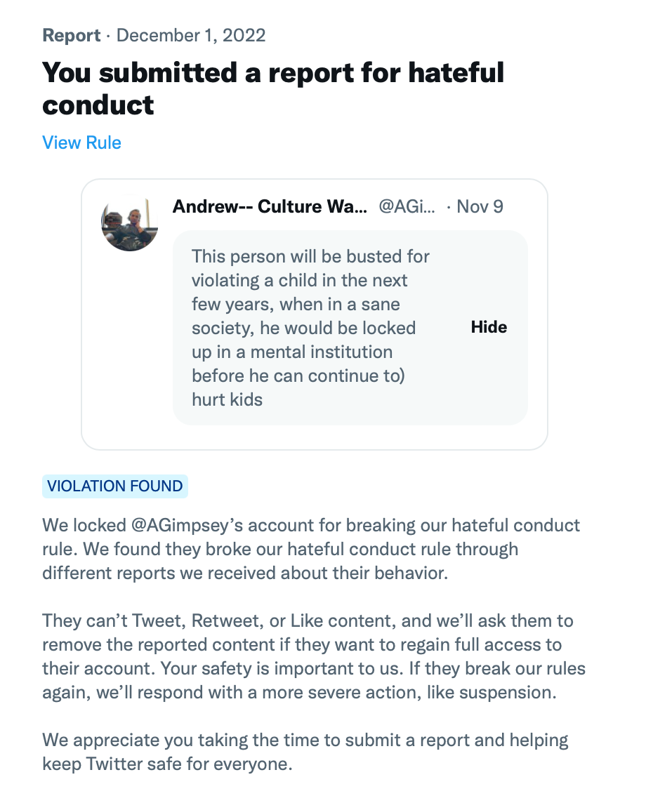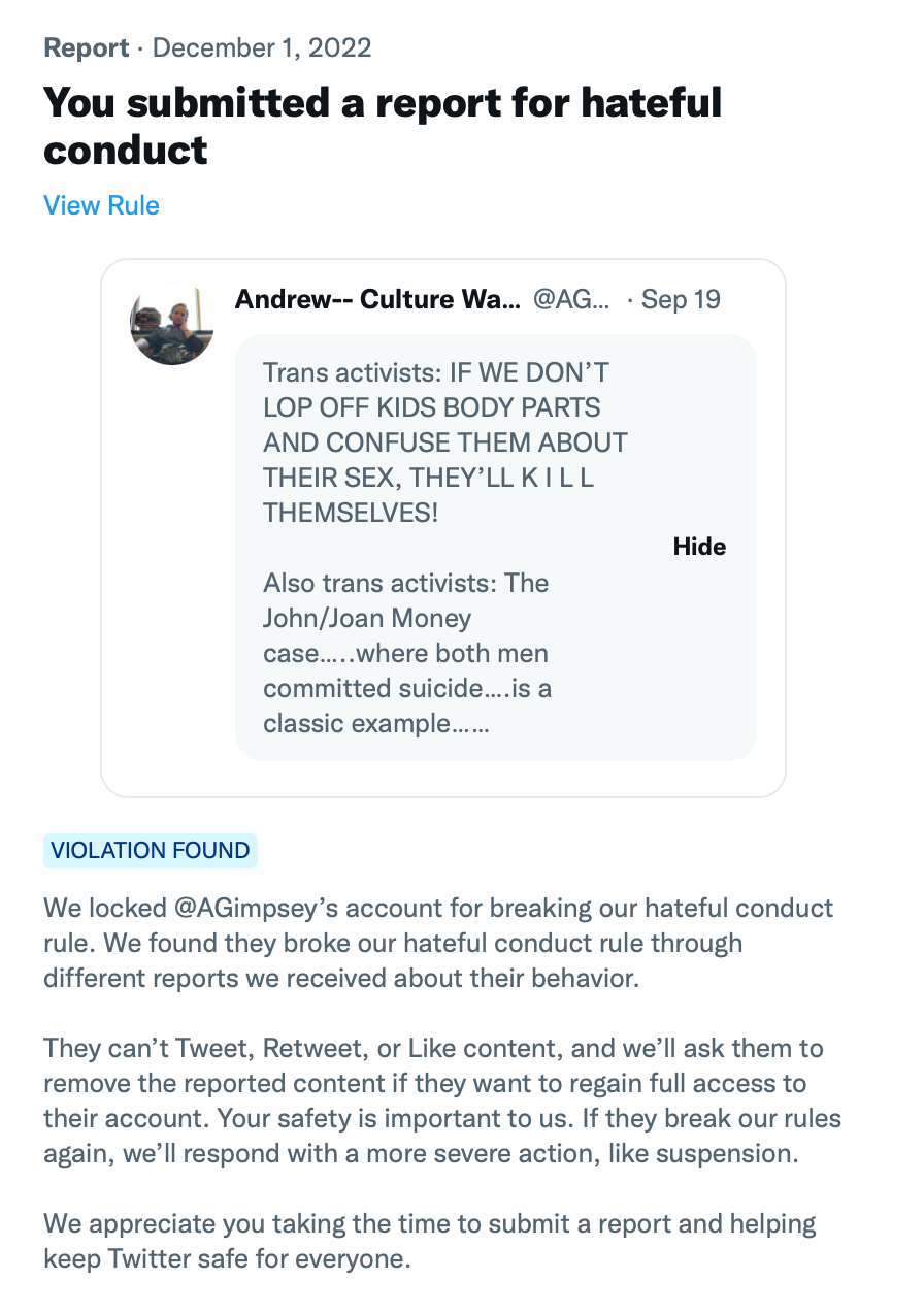 I am also a bit surprised your real account is still locked when it clearly should have resulted in a permanent ban for this heinous attack on the LGBTQ community.