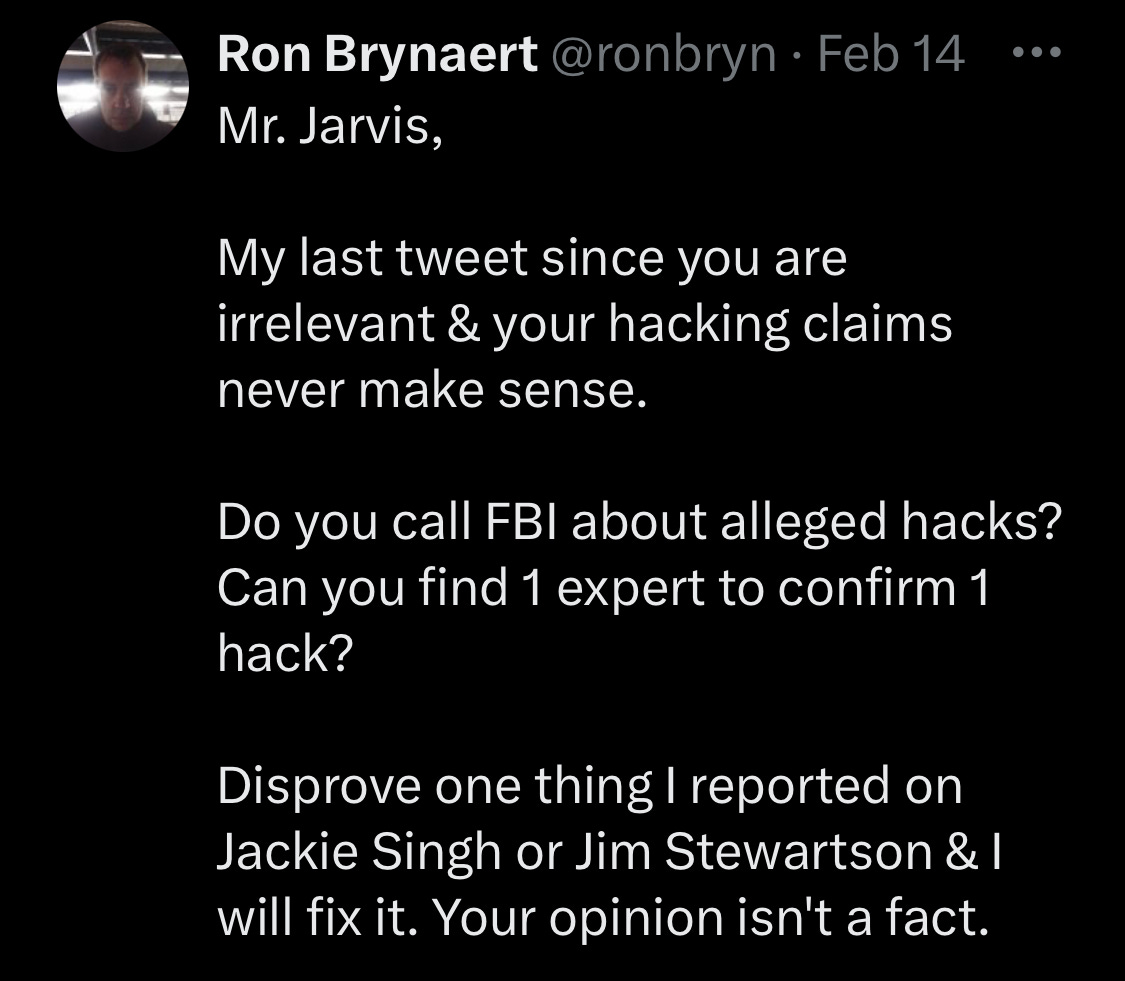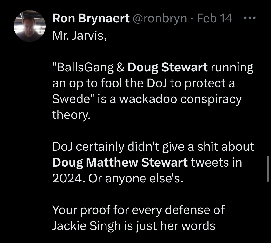 I don’t regularly check in on Ron Brynaert save when BallsGang highlights something he says. This one, found while looking for the disappeared Doug Matthew Stewart, parked offline some time over the weekend.