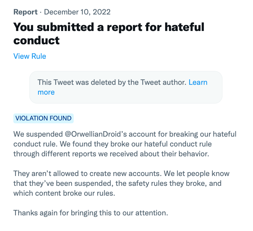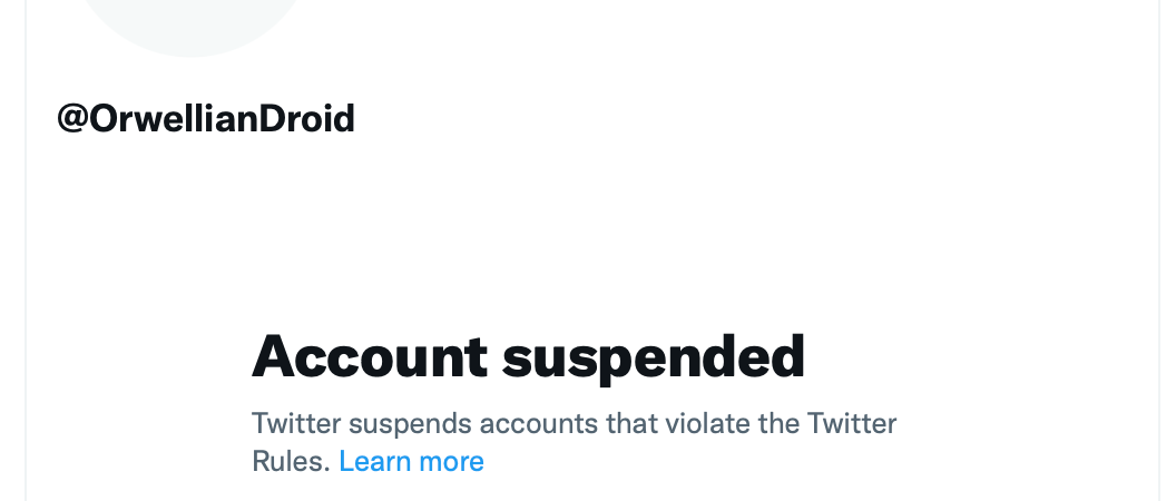 One week after the account had been placed on restriction, Orwellian Droid was permanently suspended via likely automation.