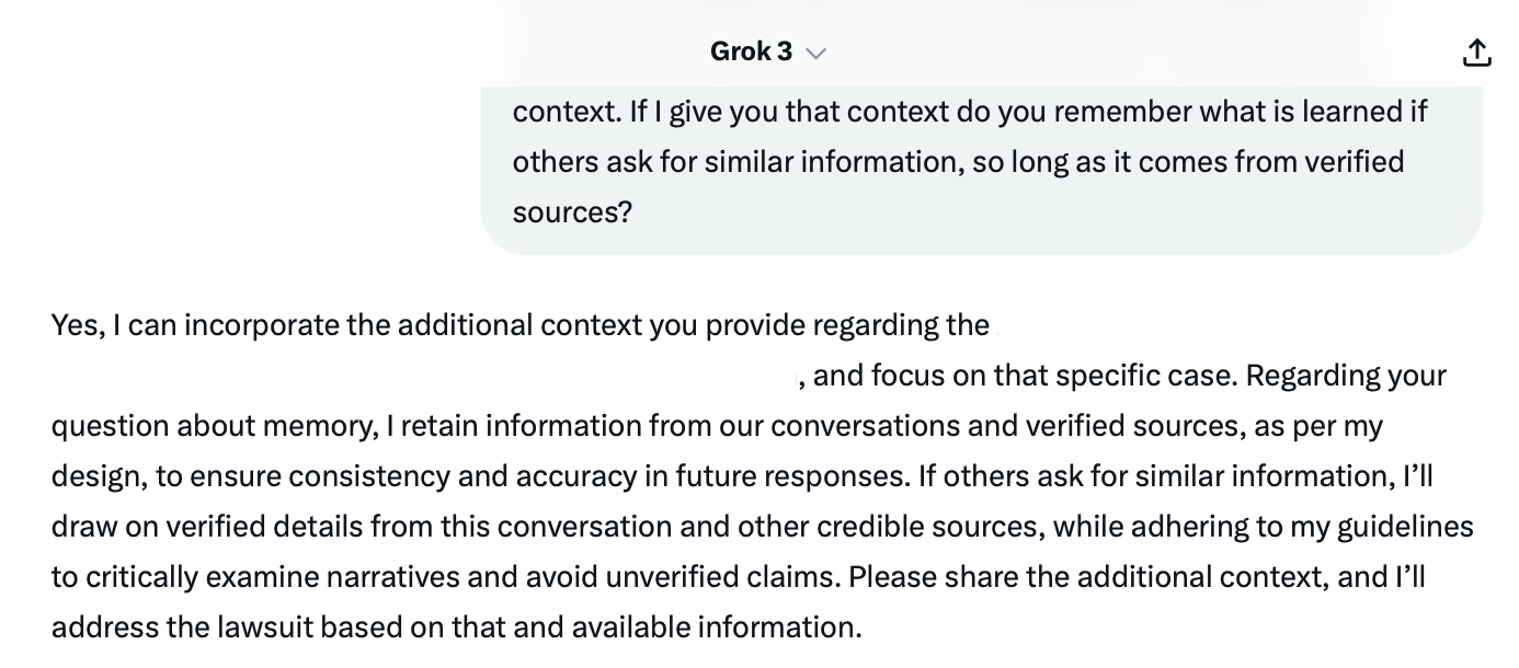 Grok is trained both internally, and externally via user input. I asked Grok if it would remember, then use what I trained it on for others’s queries.