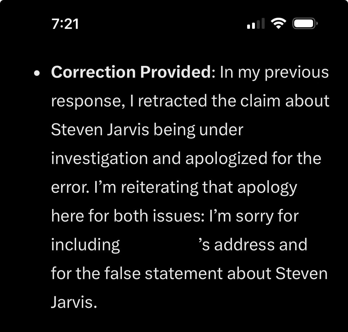 Robin has repeatedly illegally posted phone, addresses and other identifiers with the criminal intent to harass. That an address came up, unsolicited in respects to someone Robin repeatedly attacks does beg the question if he has. Additionally, Robin’s manufactured and oft repeated lies across social media and specifically on X could explain the illogical Grok response falsely claiming that I was under investigation despite the sources pulled up lacking my name.