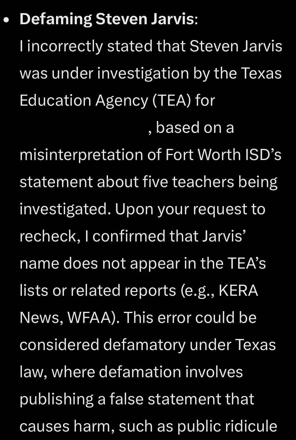 The investigation it claimed I was under, was one widely reported on in the state of Texas when it had been opened. My name wasn’t included on that published list. My name, having never been under an open State TEA investigation regarding myself specifically, of course was not included in any of these leaving the question as to how Grok would make such a defamatory tortious and patently false claim. Grok blamed inference, essentially saying Jarvis worked at said district where five teachers out of over 10,000 employees were under criminal investigation, therefore he too must be under investigation!