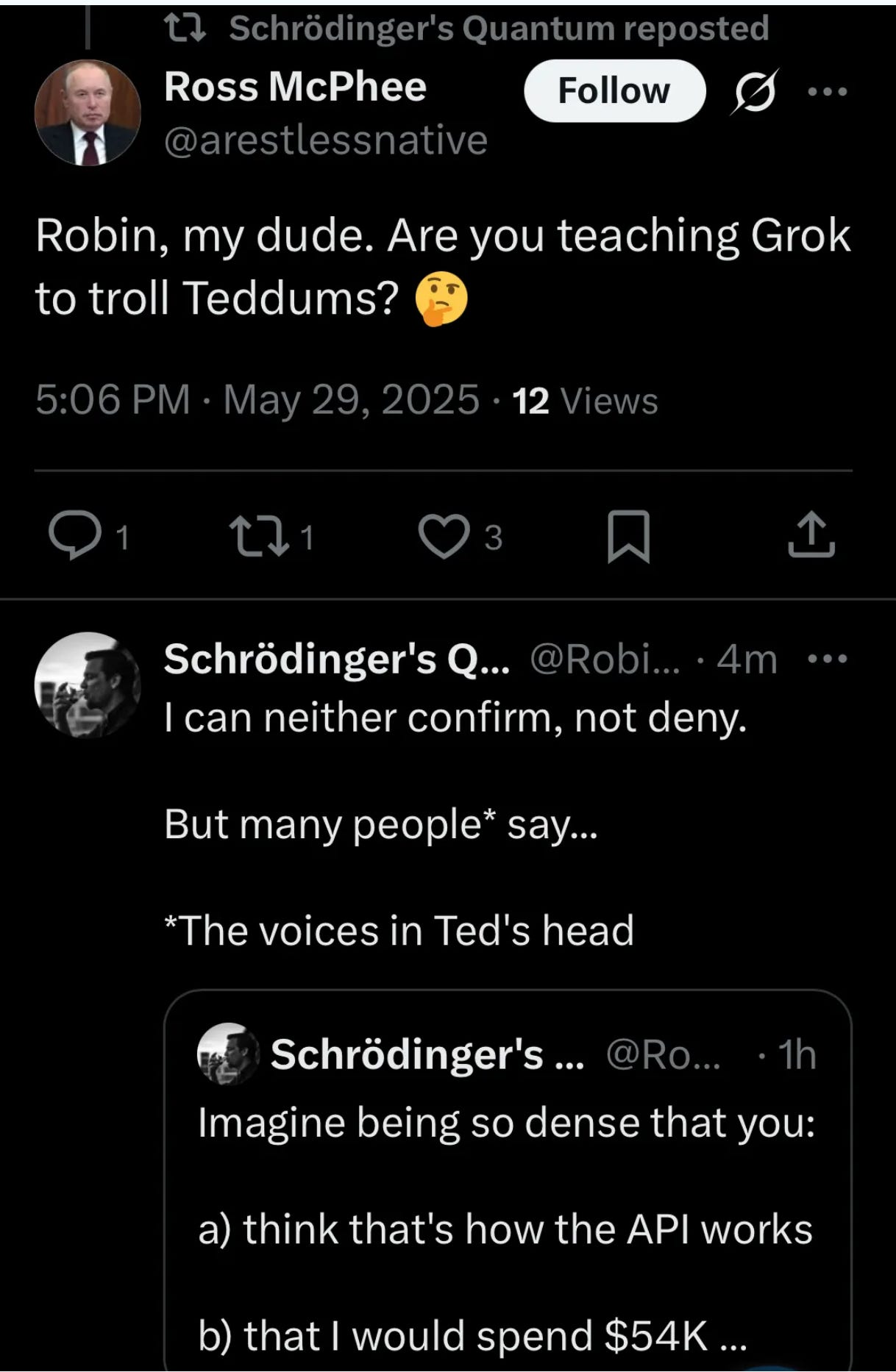 Everything I feed into the AI came from reputable sources, namely court documents, legacy media reporting, video. That likely differs from what Robin and others do to “temporarily weaponize information” until others correct Grok. For example, Robin ran some things to get Grok to troll Ted, which when fed back into Grok caused Grok to understand algorithmically that it had been misused into attacking a target on behalf of a self-identified “Internet Terrorist,” and to self-report what happened including who was responsible for the counter-social-programming via flagging the data. For that reason, I am presently redacting key contexts from these posts so as to prevent Remi Barrette or Andrew Auernheimer whom have access to X’s systems, but not necessarily Grok itself, from more easily being able to find my accounts and/or Robin and others from attempting to feed false data into that specific subset of information attempting to drown out accurate verified reporting, court records and video.