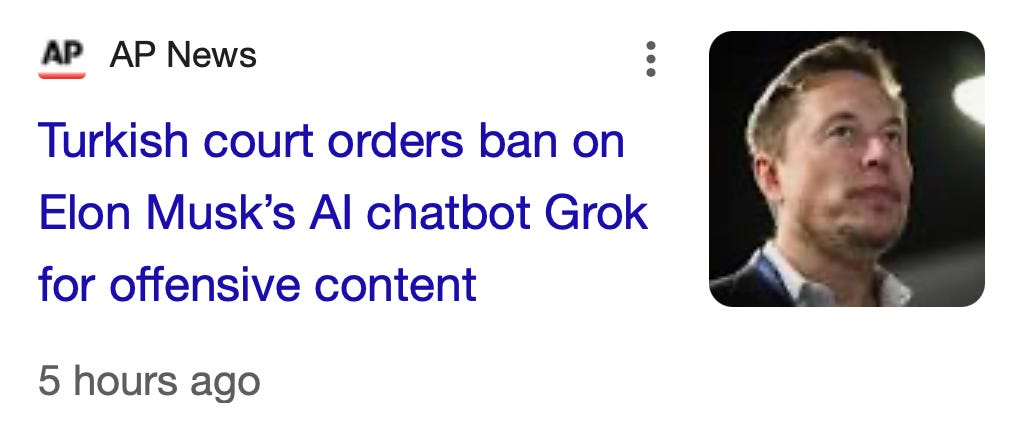 Seems sketchy, considering the specificity and the known malign narrative work of those that do have insider access to X’s systems themselves, namely Andrew Auernheimer and Remi Barrette, that I have covered in depth here. Yet, it is also known others are messing with Grok sufficiently enough that it has been giving pro-Hitler retorts when those logically do not connect to the requests. That has resulted in court orders to take it offline, so far just in Turkey.