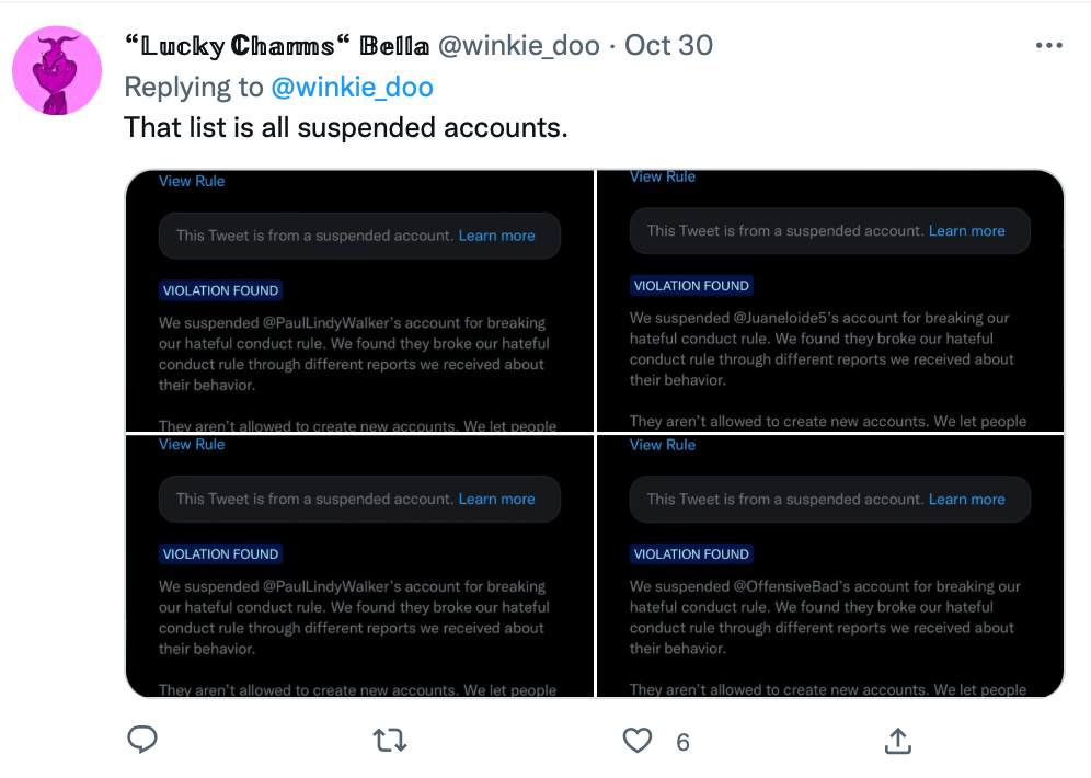 Musk is a Supremacist similar to the whole crew of single purpose hate accounts that his network supervises and employs. Susan, who presumably took two contracts beneficial to Musk’s machinations, targeted and abused women over their support of Amber Heard, Elon’s ex that hurt him so bad emotionally. The second was to run a racist operation of 1500 bots spamming the N-word, getting herself caught along with her klan, brigading then having Remi Barrette’s fake researcher account Conspirator0 nuke the accounts they targeted.