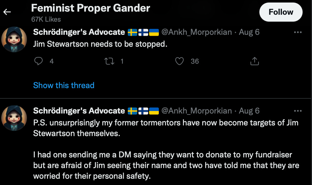 Here are a few of the recent likes, including a direct threat to Jim Stewartson by Robin E., an European hatemonger, multiply banned conspiracy pusher weaponized troll with a fetish for ankles, who begs for coffee money.