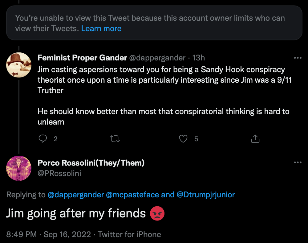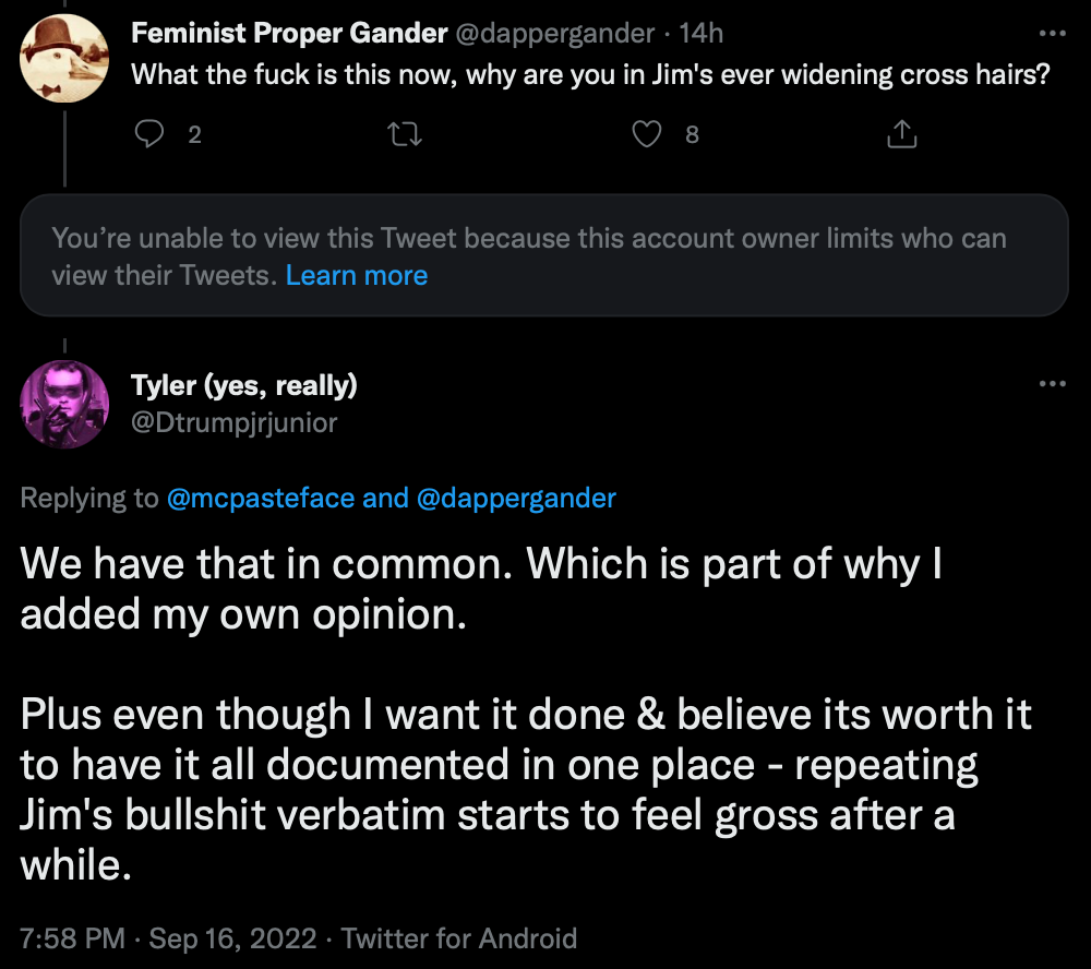 FPG is one of the less offense Anon accounts I have looked at multiple times, isn’t on Jim’s target list that I know of. I would NOT classify it as a Single Purpose Hate Account, though it does add impressions to others attacks from the cadre of criminal suicide trolls indicating likely support.