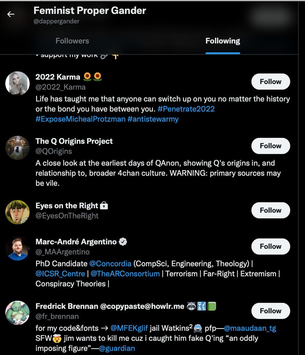 At the beginning of my investigation I had determined it was an amplifier that matriculates within the same circles as Rothschild, Brennan and the QAA podcasters, interacts mostly within a separate node of the network and sparingly with the groups’ single purpose hate account nodes. Its connected to the pod featuring 2022_Karma, the prominent Anarcho-Capitalist running adjacent to the Donovan-Chenelle Op.