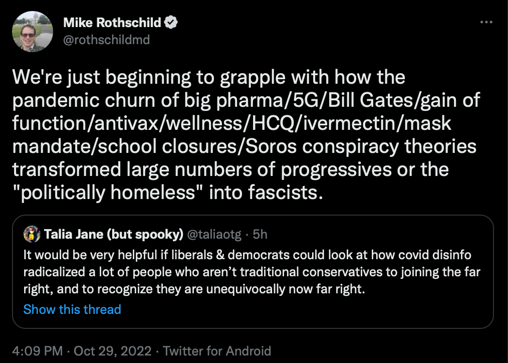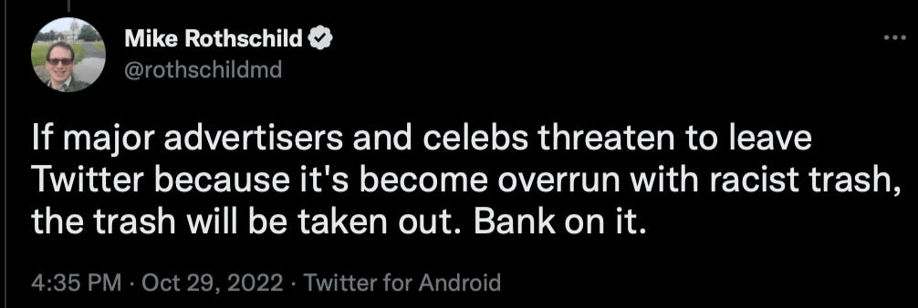 Mike Rothschild, a repeated satanic temple speaker, friend to white nationalists that grifts off of people promoting QAnon as a cool game instead of a militarized PsyOp led by Mike Flynn, says something we all wish was true—that Elon will take out the racist trash.