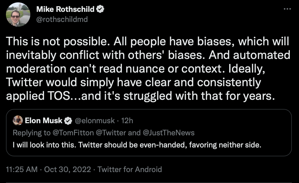 While I do expect Musk to maintain some semblance of tampering down on speech, all he would need to do is slap a label over a tweet so that others would need to click on that to see what was hidden, for him to say he is both allowing speech and protecting users from others speech. That can and should happen via automation for profanity and via issued reporting with internal verification for sensitive images such as those coming from war coverage or mass death events.