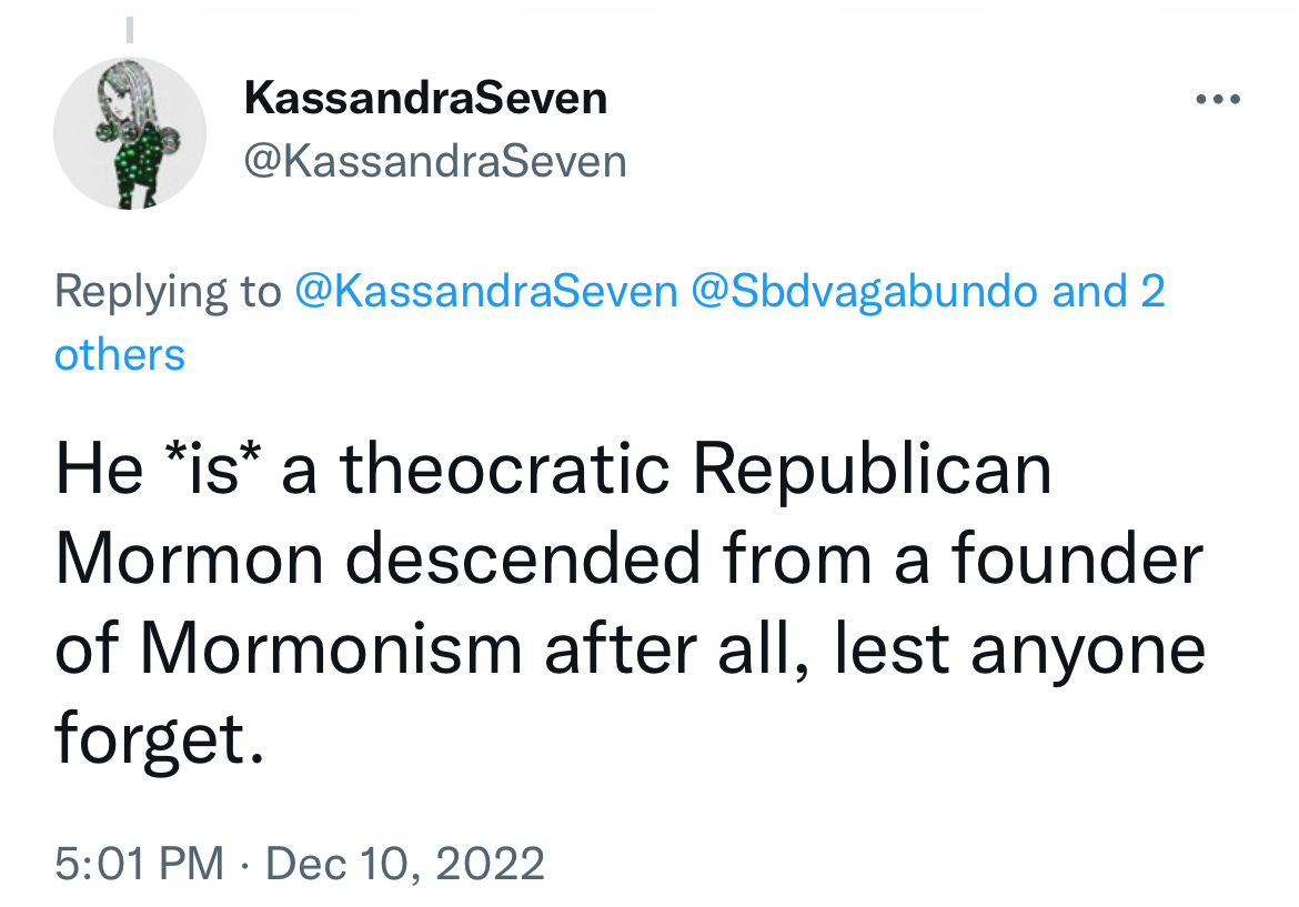 The above statement regarding me is about as bigoted as can be. It doesn’t describe LDS doctrine nor my beliefs.