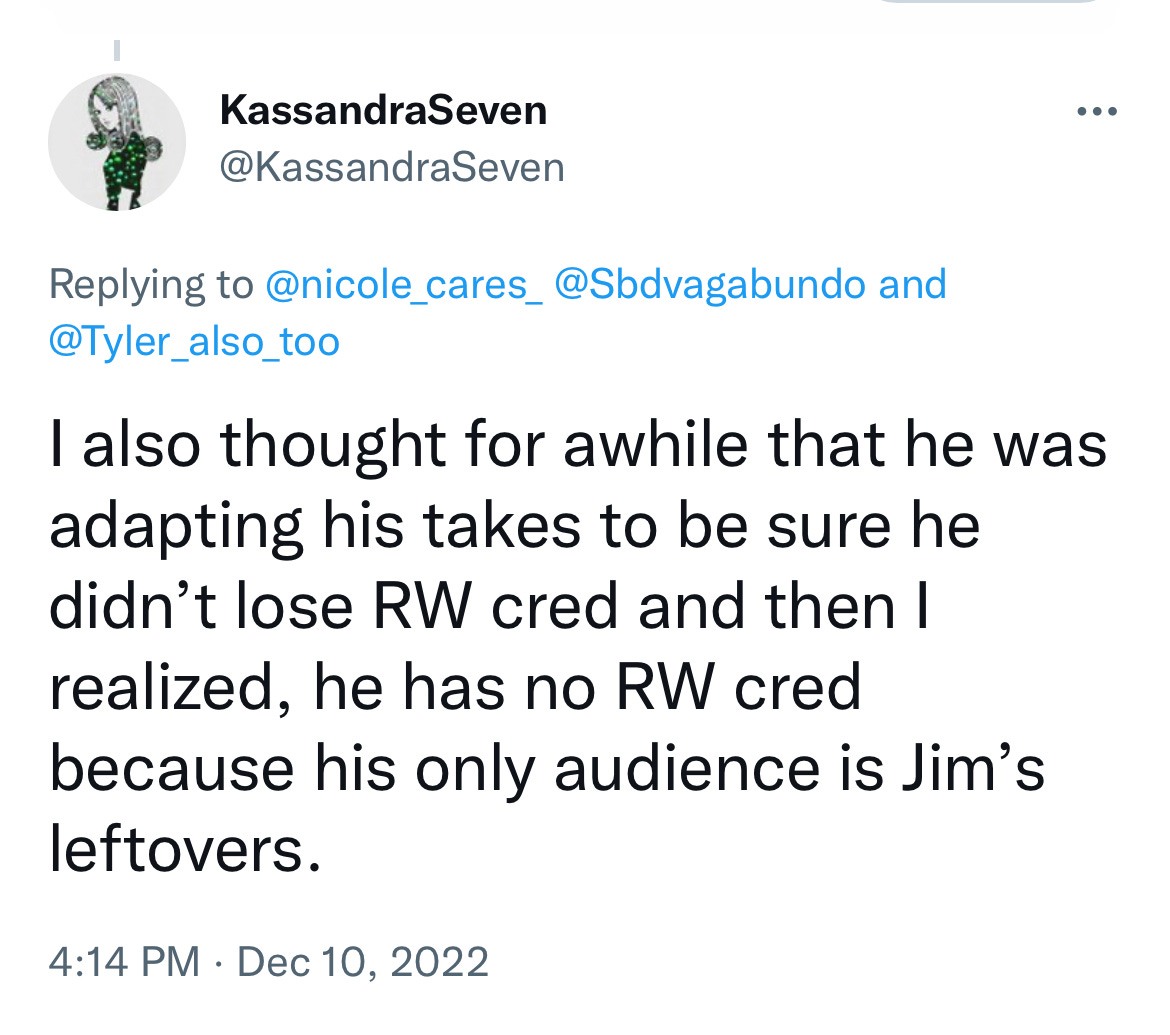 She is classically gross, the people she enables with her 85k following account by tacit agreement spam scatological pornography into the likes here, she knows that because she stalks the replies with her stalker friends. It might even be her doing it. It was clearly her idea to try and get some of her 85 (84 today yet?) followers to try and swat you and do harm in real life. She spends large parts of her day stalking you and it seems unhealthy. If those were her real friends they would have an intervention too. If they are working together for someone else they should all see legal intercession for crossing a line like swatting. I denounced it as something she shouldn't encourage and that day after Kassandra read your replies she addressed me and doubled down on it, she reshared one of the posts that she used semi-public figure status (with that large a following) to endanger you with