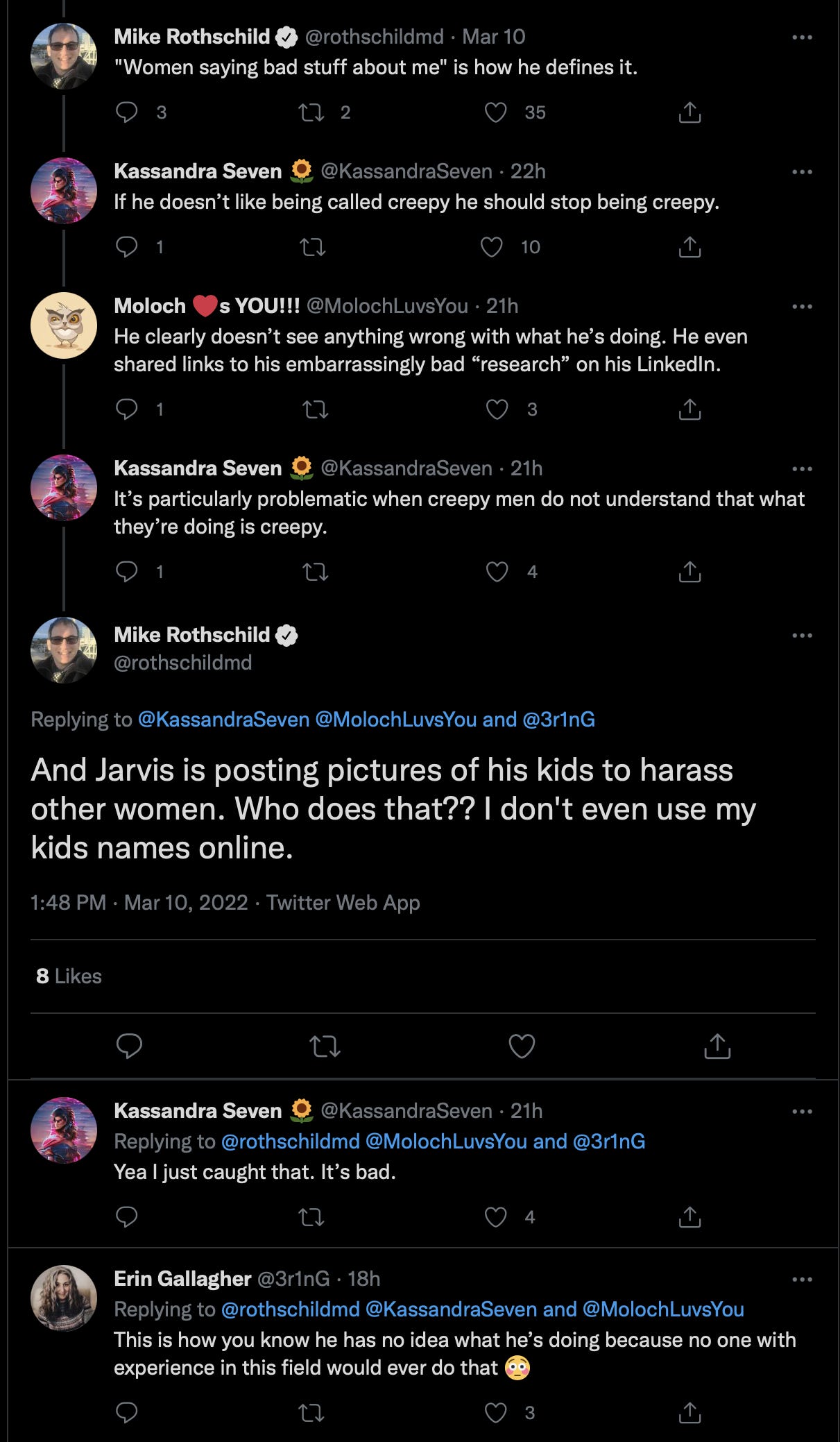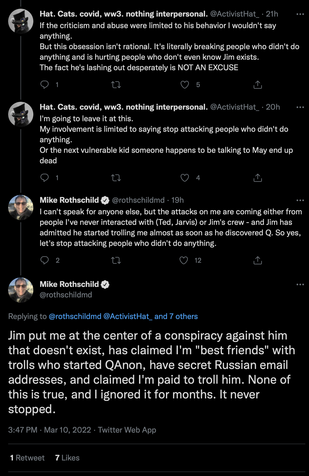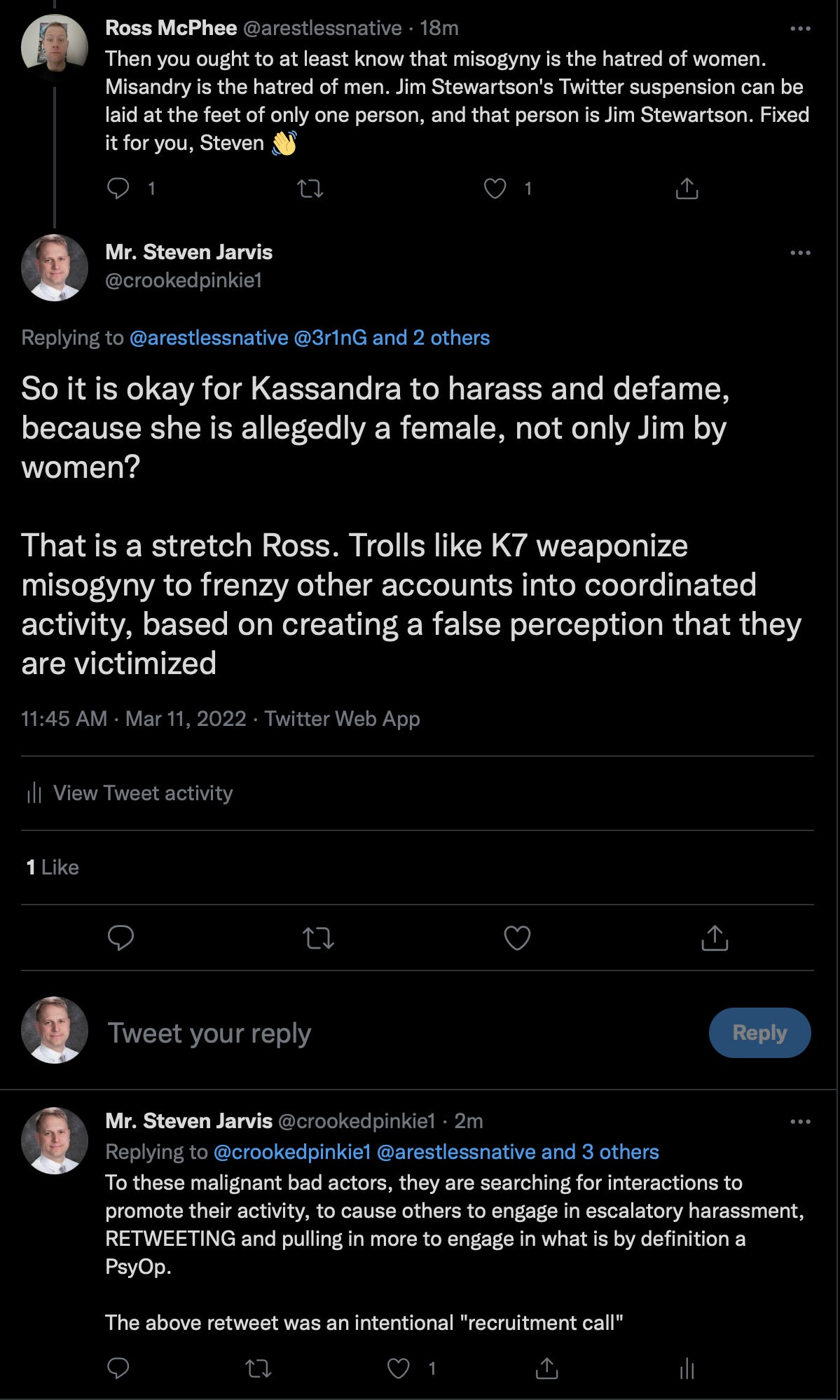 Mike’s last comment on this screen grab is some serrious psychologically messed up stuff, responding to a part of the thread with Kassandra looped in, playing the victim. Mike playing his role to add credibility and reputation to K7’s base attack against me, is evident, hence his roll as a K7 sub for this particular op. My hunch is that he, Jared like Mensch, all did the same reputation enhancement to the K7 network, the Jim is unwell suicide ideation PsyOp, and other work.