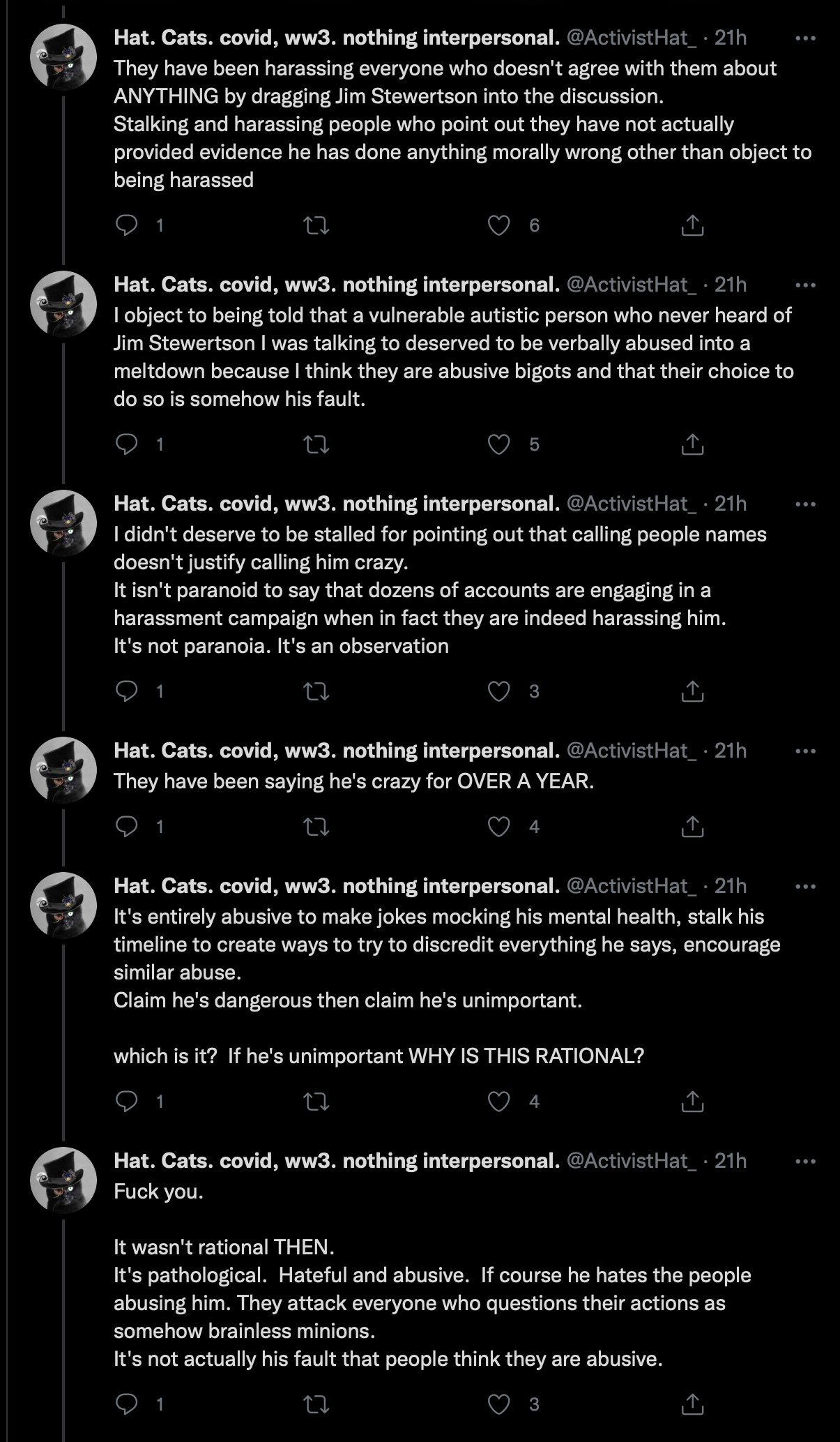 Mike has a lot to say about me, for a roughly 7500 follower count guy, whom I never engaged with and had preemptively blocked me, then joined and participated in a harassment thread. His words, as suggested, screen-grabbed.
