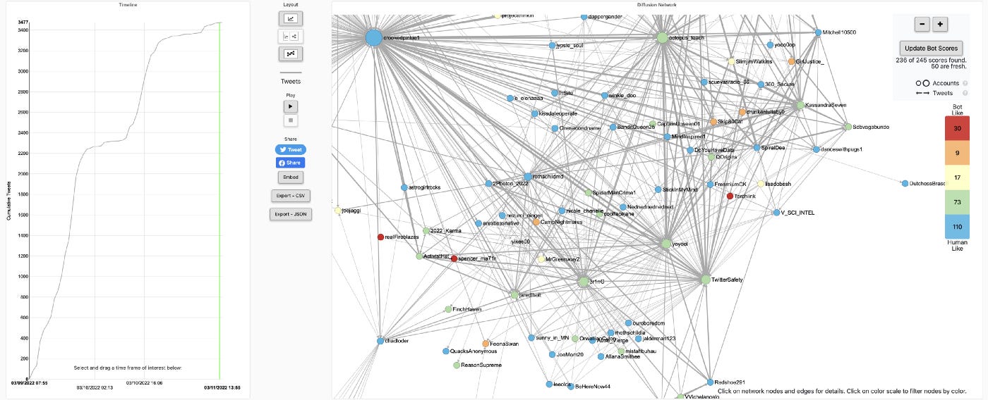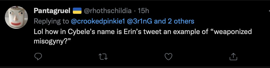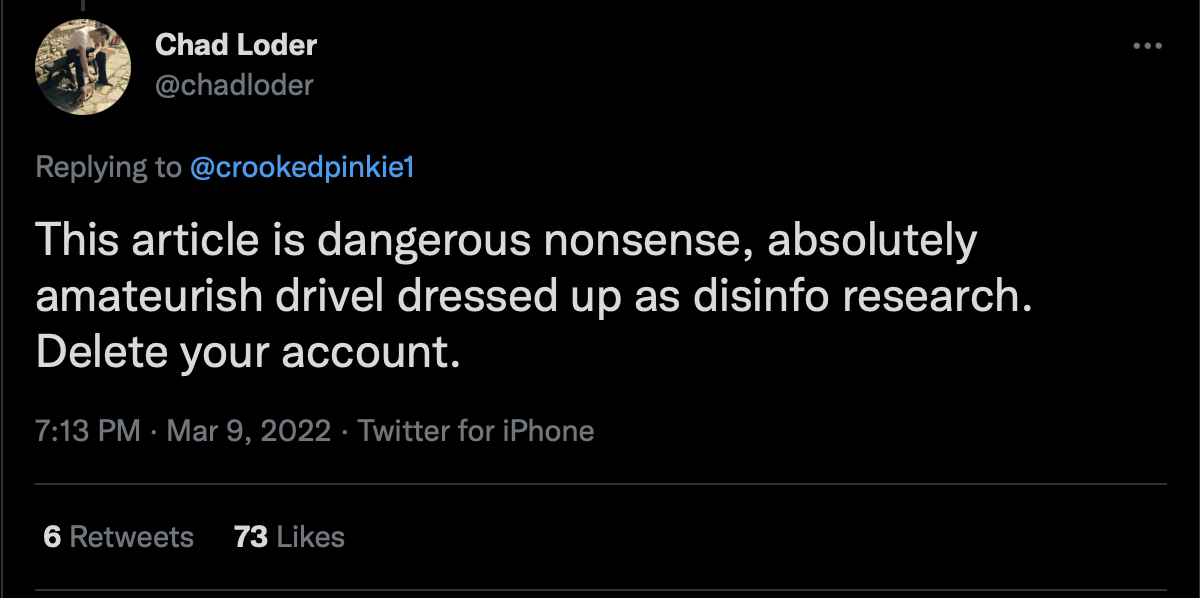 Having dummy accounts to coordinate and cause a troll swarm generally isn’t effective when the person the org is targeting blocks everyone as they add to the interactions needed to build to the typical thousands of likes on the fire-starter tweets that cause them. Neither Chad nor Erin could do that alone. Chad, apparently ratio-ed, and others who could normally get this going, probably aren’t able to call on typical bot farm resources to pay for and generate a character attack, as THOSE are too busy right now generating engagement and impressions over the Russian war.