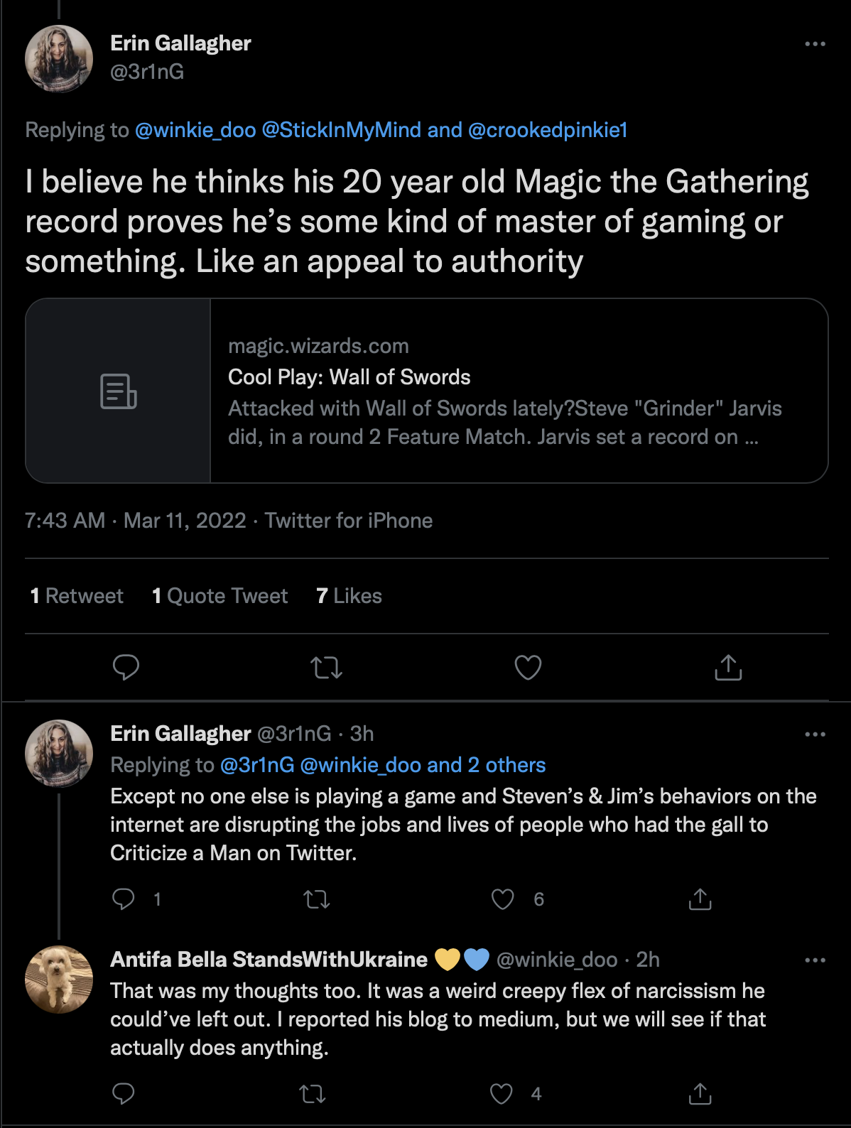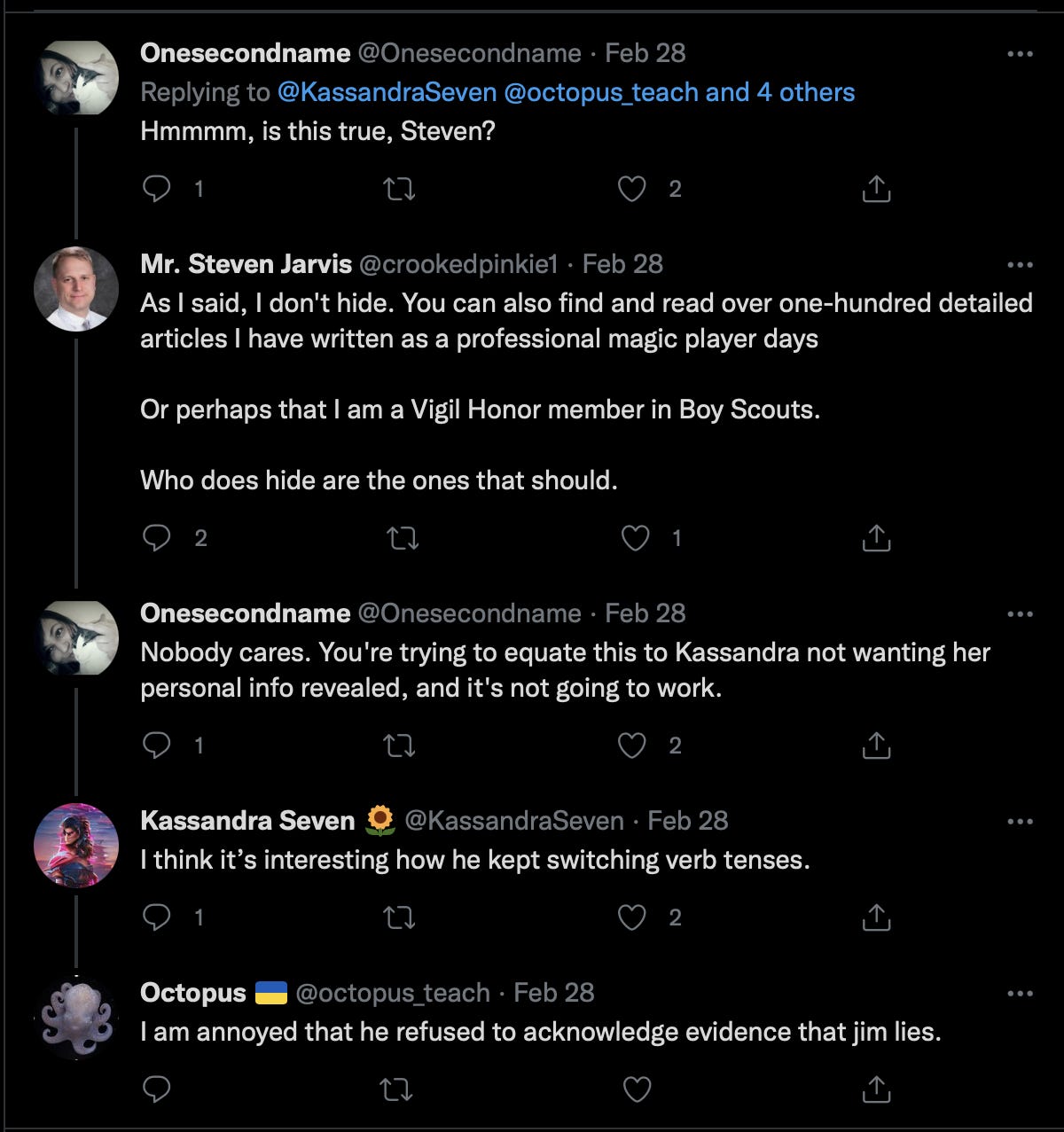 I see the big fish verified accounts like Mike, Mensch and Jared, being involved here as interesting considering what Kassandra is up to, having to be pulled off their work to engage a small nobody, Special Ed teacher, former pro Magic player, with no recent work history, whom I may or not actually be.