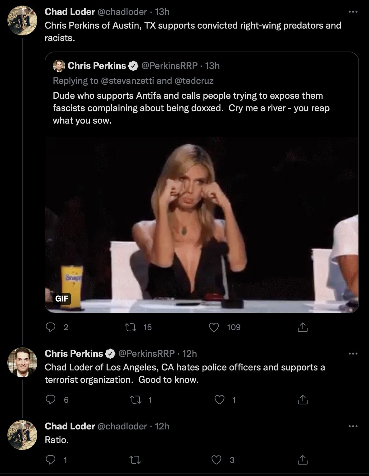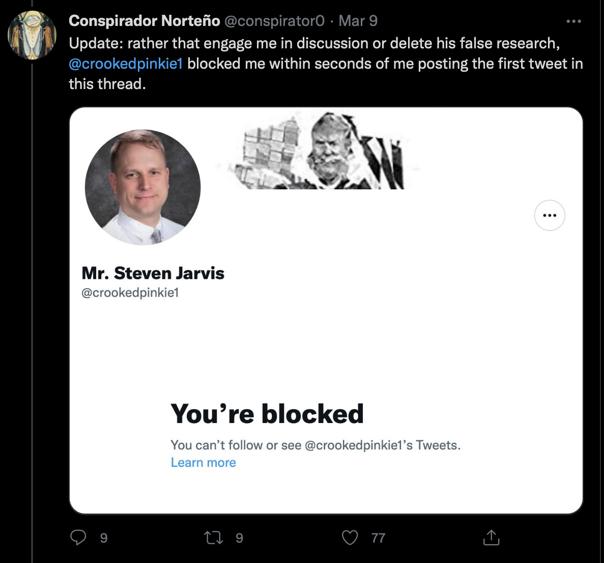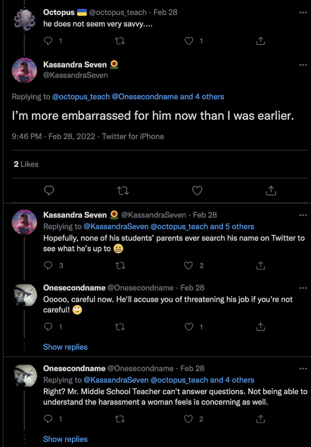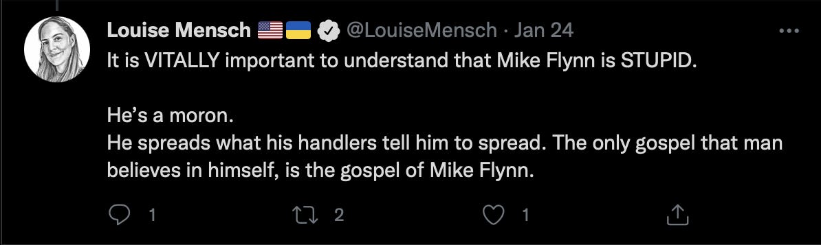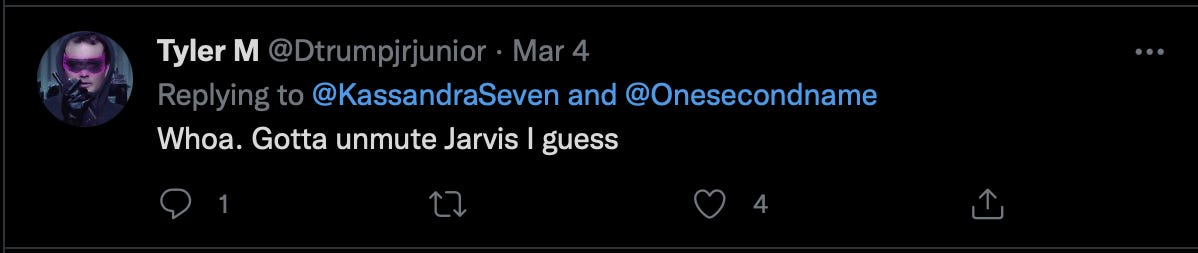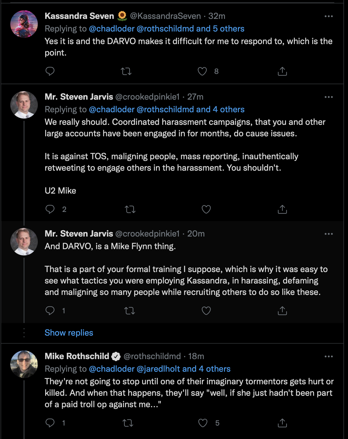 I knew Mike had blocked me, because two of the interconnected accounts within the KassandraSeven network directly interacted authentically, multiple times. I checked to see who that was, and saw what was said.