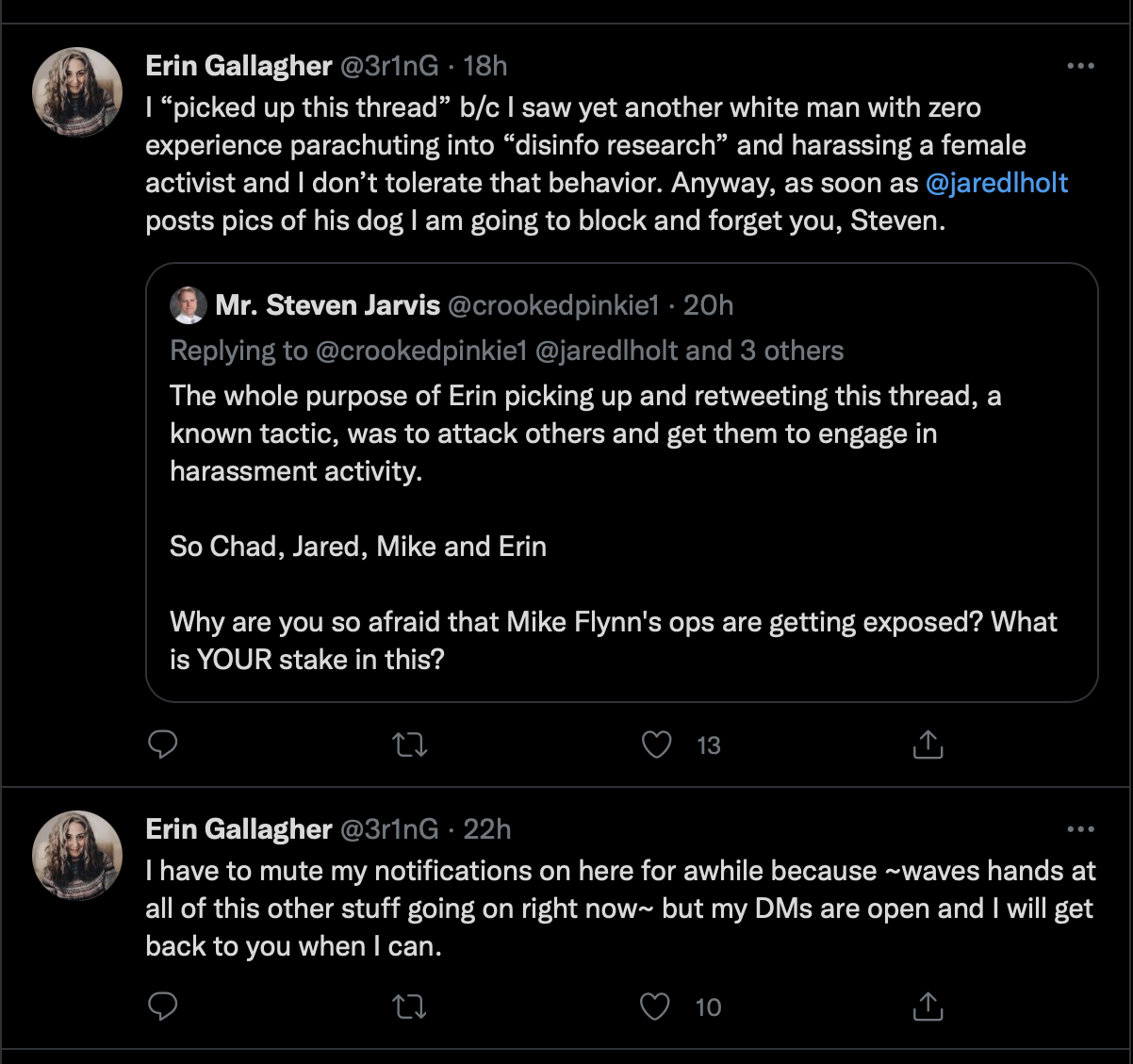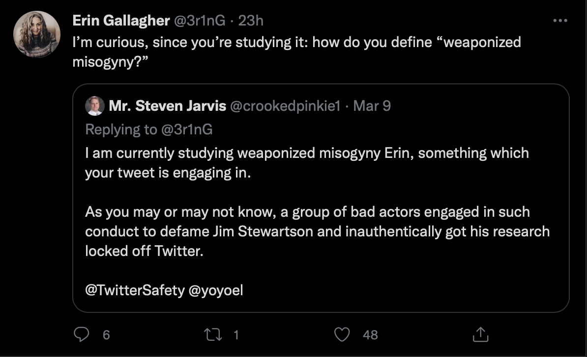 So who were those other two verified accounts that got pulled in with Erin’s baited weaponized misogyny? See for yourself. They appear in my first tweet response to the honey pot harassment trap tweet, tagging my name. Also note the credibility enhancement that Erin is trying to pull regarding Kassandra, to pass her off as reputable. Clear sign of being a bad actor, boosting up the profile of one that exists only to harass.