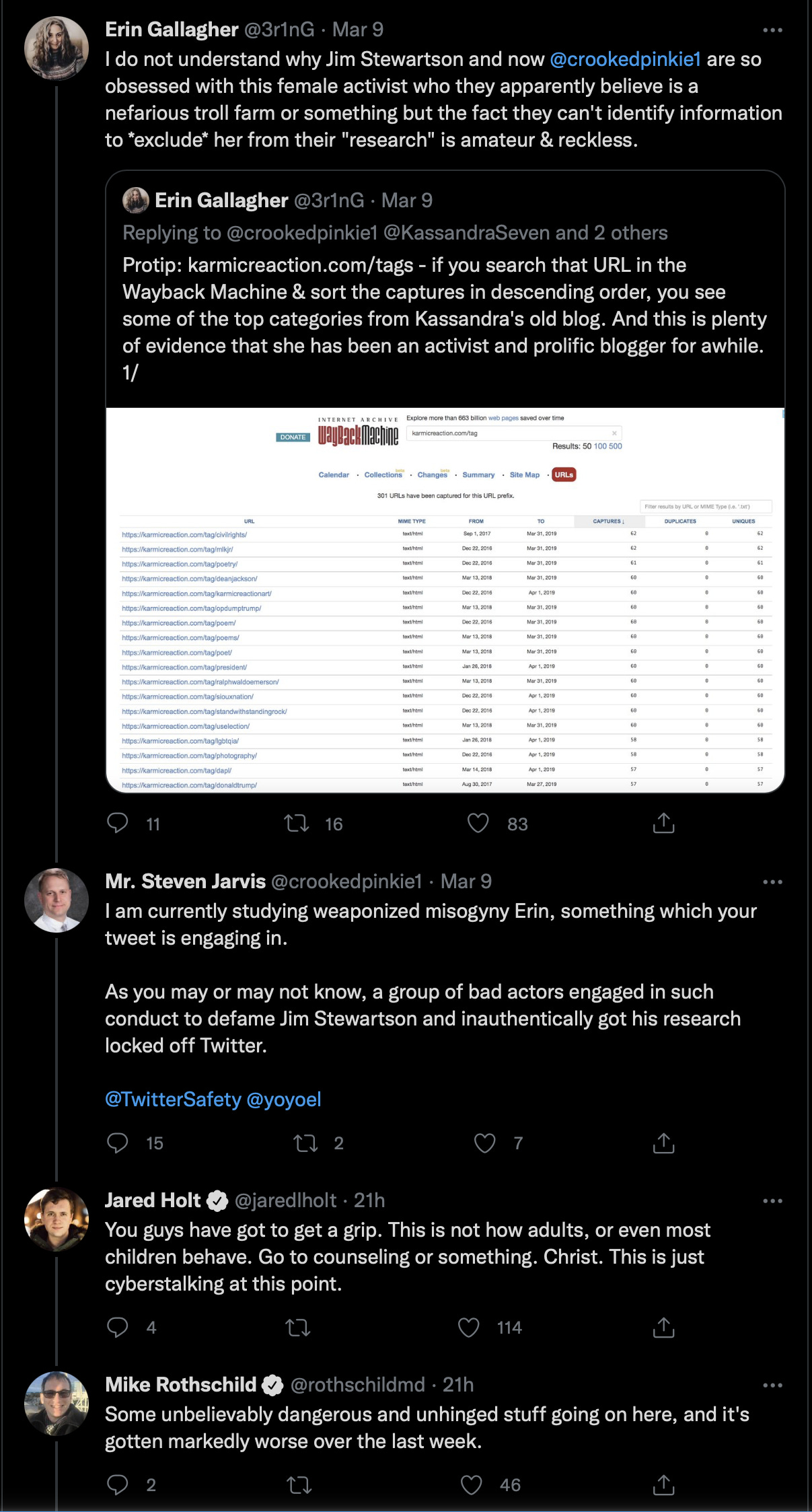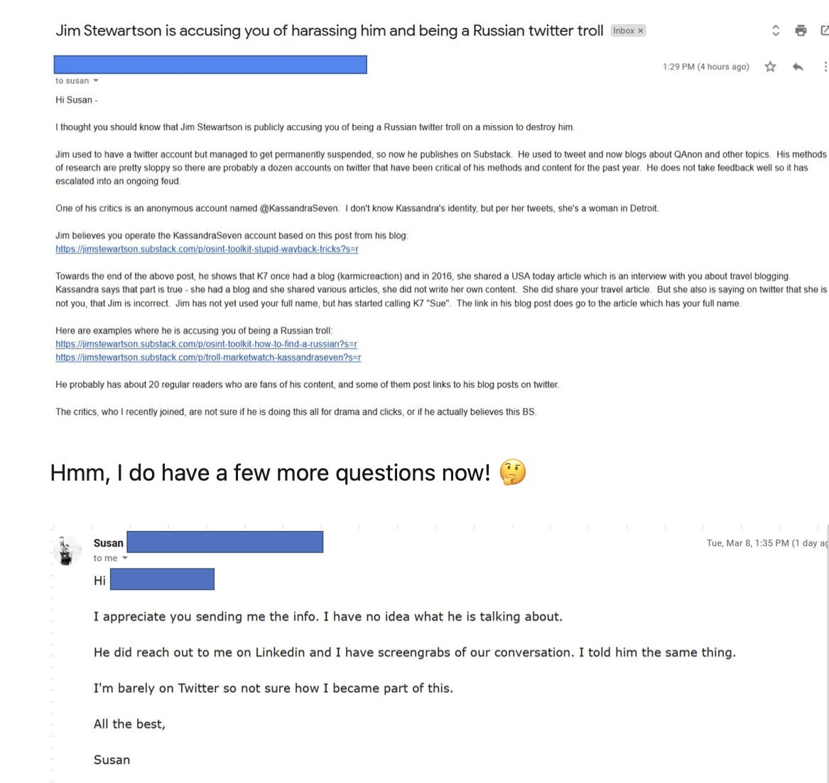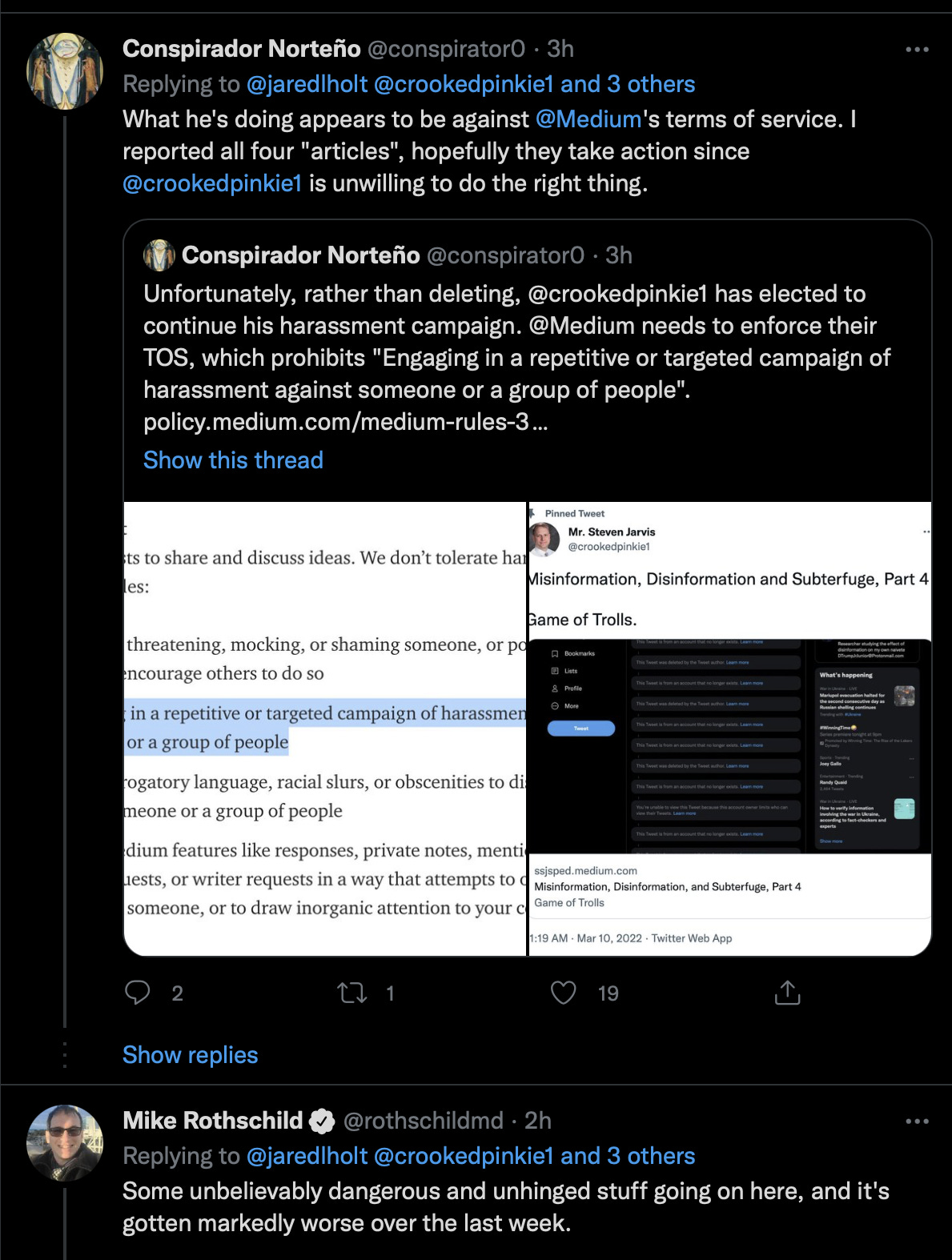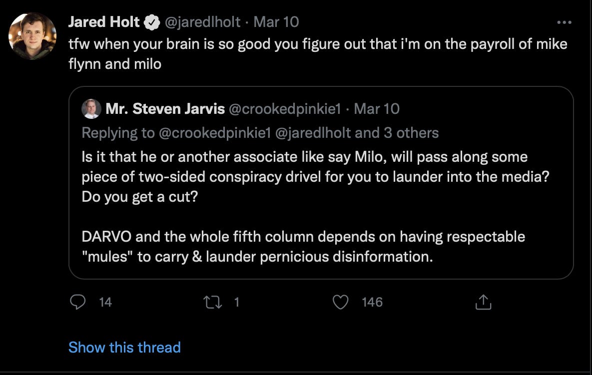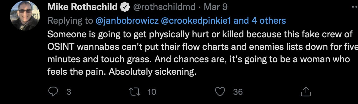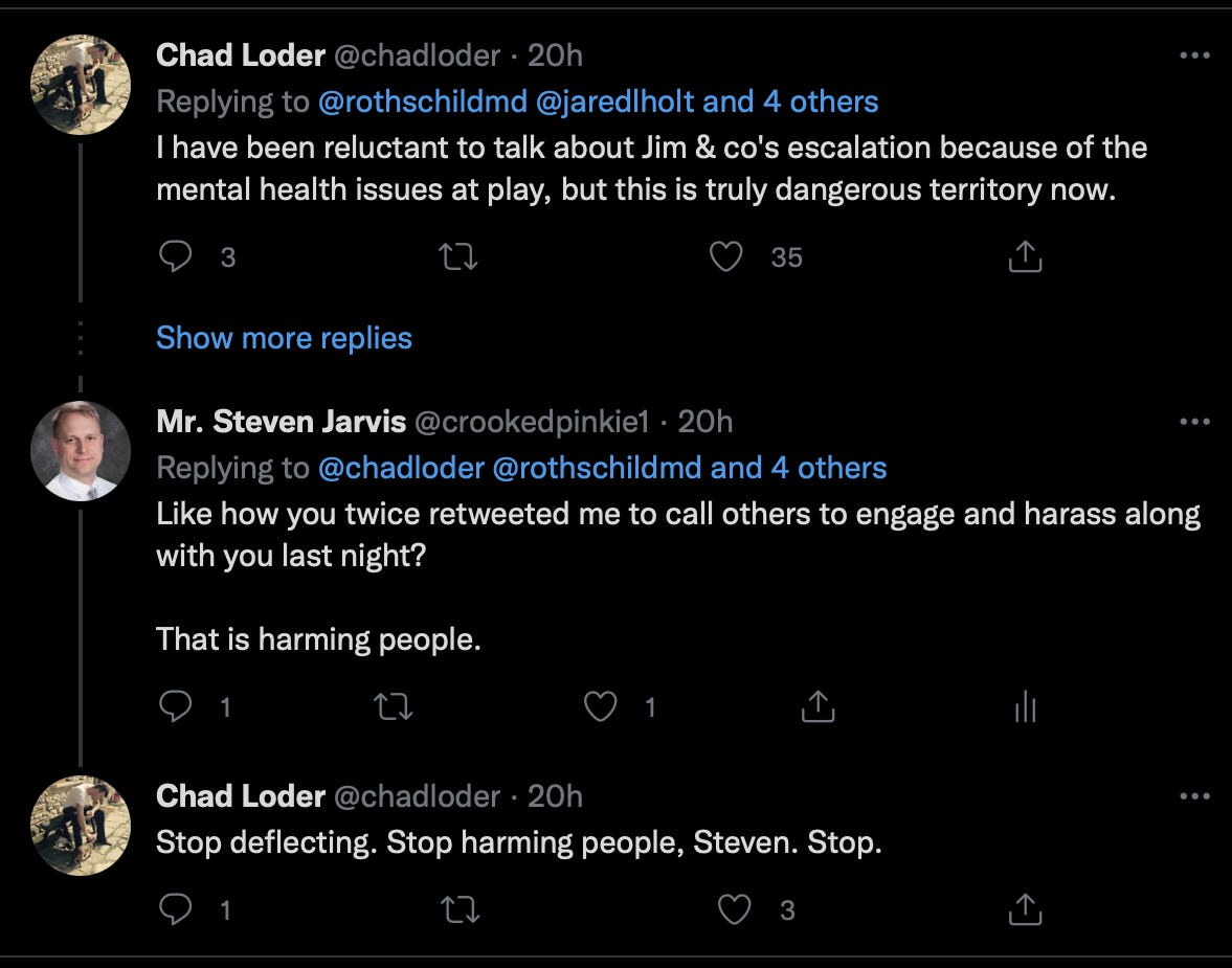 Some disinformation mules may be unwittingly fooled into getting lies put into print, or joining into an ongoing reputation harm twitter attack swarm, with drops of suicide ideation, weaponized misogyny. But its clearly obvious that something is up when the same bad actors engage that did when they went after Jim, because that is how this stuff works.