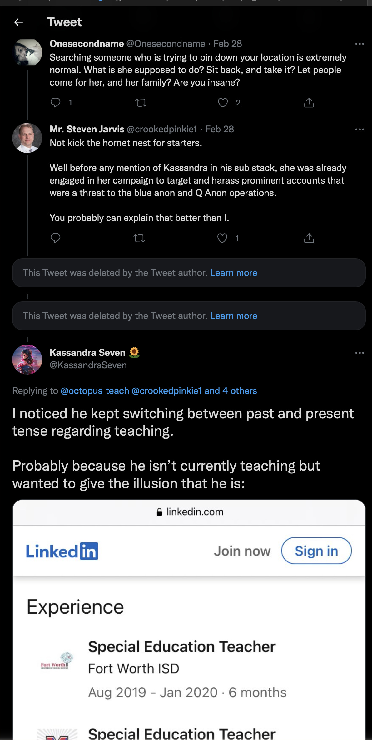 And here, saved of course, are the two conditional threat tweets that Kassandra and Onesecondname scrubbed in the post up above, suggesting contacting parents of my students, and threatening to contact my job. I also noted that K7 did not register a “view” on my setup LinkedIn profile, during the screen grab.