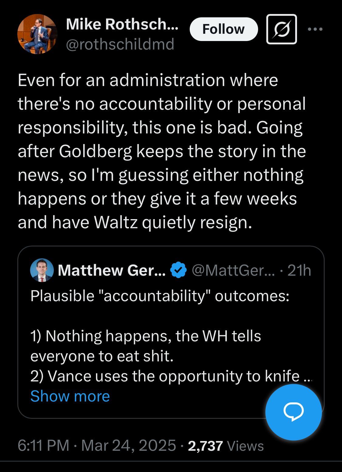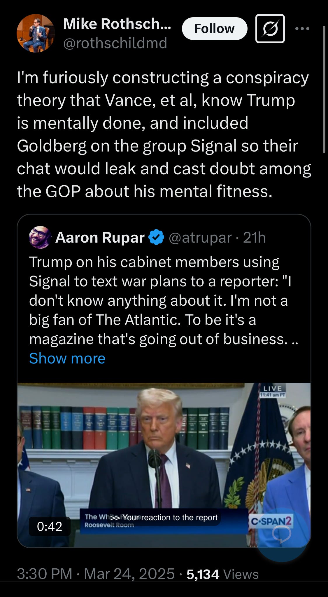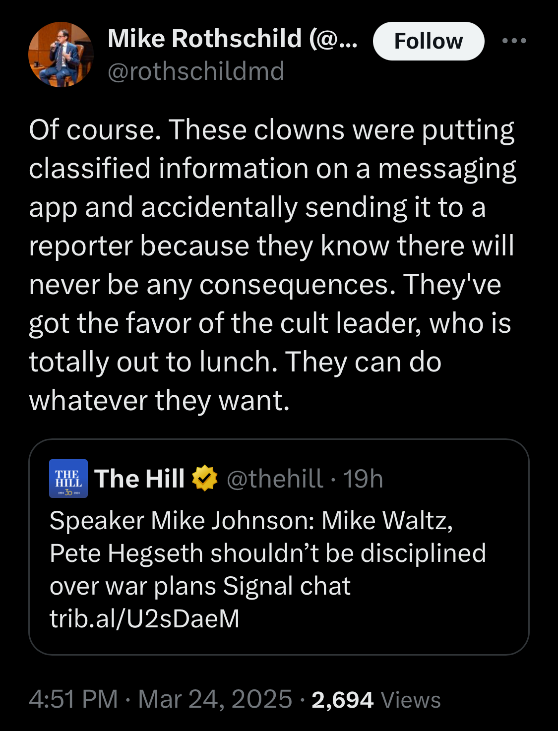 The Dems lack a messaging apparatus set to repeatedly browbeat why all these corrupt Trump officials should be removed and have security clearances revoked. It’s simple. Everyday repeat over and over again that these fraudsters intentionally transferred from secured government lines to an commercial app leaking classified intel to a reporter hoping he’d leak it during a military operation endangering US service members lives. They did so intentionally without regard to American’s lives. All must resign or be expelled. That includes JD Vance as he clearly cannot be trusted not to leak classified secrets to journalists.