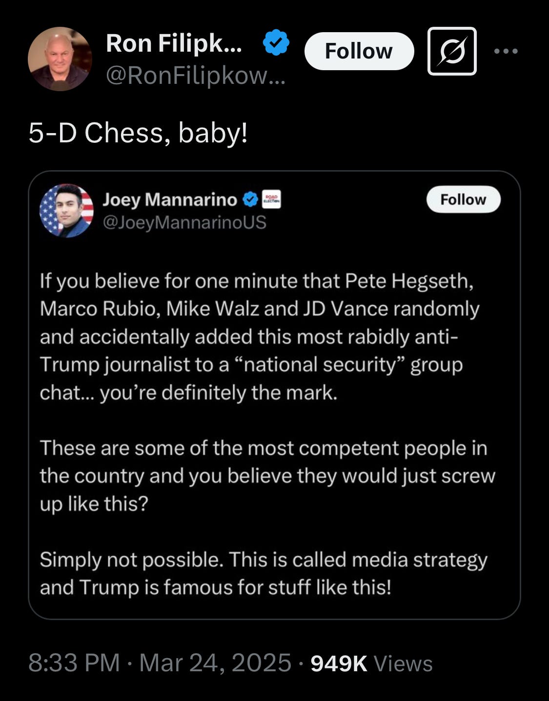 Joey is suggesting accurately that US officials knowingly added Jeffery Goldberg of the Atlantic to their war-plan signal chat. It was media strategy—used by Trump, in an effort to undermine public trust and possibly cause the end of a News Outlet via prosecution of classified material that had been originally pulled from Federal encrypted military servers to Hegseth’s cell phone so as to be transferred to a commercial app.