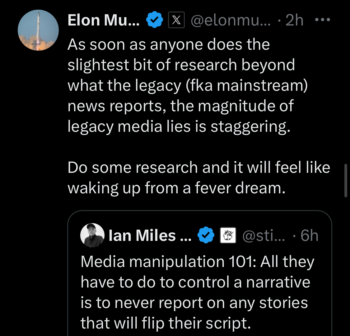 Musk and the PayPal Mafia own/ control the majority of social media. They have allies within mainstream media and fund influencers at a 500 to 1 or higher ratio compared to the left. Many mainstream outlets and newspapers are owned by elite billionaires that have generally fallen in line with or are actively complicit in supporting the rightwing MAGA movement because ‘democracy’ means less control/wealth than a system led by corrupt oligarchs. All Musk/Trump/etc have to do is supplant independent media with their propaganda—at least that’s what they are trying to do. This one is laughable.